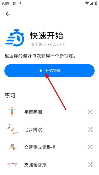 4、快速開始界面,可查看包含12個練習、時長7分的鍛煉計劃,點擊開始鍛煉即可進行,練習有手臂畫圈、弓步蹲跳等多種類型。