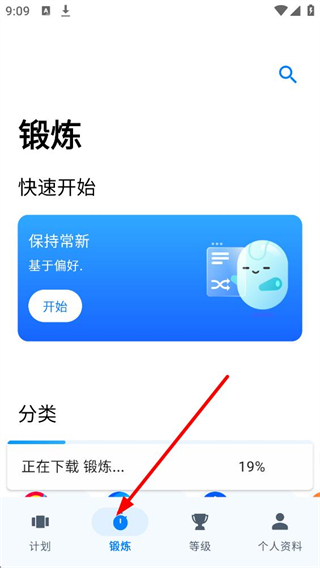 3、進入鍛煉界面,有快速開始和分類鍛煉選項,快速開始可基于偏好獲得新鍛煉,分類鍛煉可選擇不同類型的健身內容。