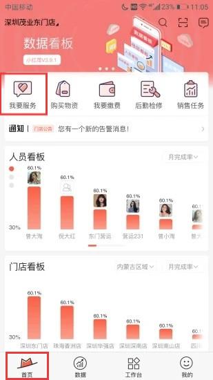 2、切換至首頁,點擊我要服務功能入口,進入服務申請界面,可發起設備檢修、物資申購等門店運營需求。