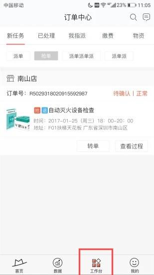 3、點擊底部工作臺標簽,進入訂單中心,篩選新任務、已處理等分類,對派單進行轉單、進度查看操作。