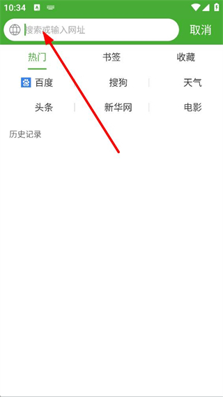 2、激活搜索欄后,界面會顯示熱門書簽收藏等分類,包含百度頭條等常用選項,可直接選擇對應選項,或搜索欄輸入內容,快速進入對應頁面。