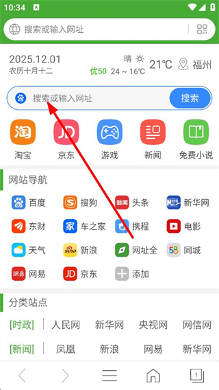 1、進入瀏覽器主界面,可看到搜索欄及淘寶京東等應用入口,還有網站導航和分類站點板塊,點擊搜索欄即可激活輸入框,準備進行搜索操作。