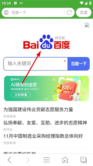 3、選擇百度選項后,會進入百度網頁版界面,這里有搜索框及各類資訊內容,搜索框輸入關鍵詞,點擊百度一下按鈕,即可獲取相關搜索結果。