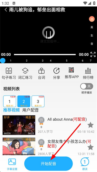 3、進入選定素材的頁面,能看到視頻播放區域及句子練習等功能,點擊開始配音按鈕,進入角色選擇頁面。