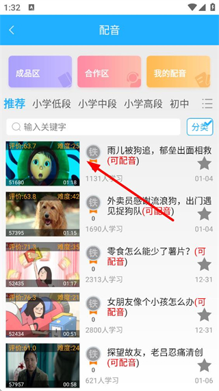 2、進入配音頁面,包含成品區、合作區等分類,可按學段篩選內容,選擇雨兒被狗追,都坐出面相救這類可配音的素材。