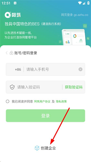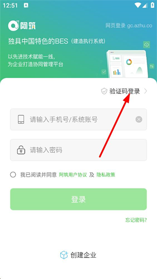 1、進入阿筑登錄界面,有賬號密碼登錄和驗證碼登錄選項,密碼登錄需填手機號或系統賬號、密碼,勾選協議后可登錄,還能選忘記密碼或創建企業。