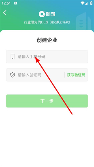 3、進入創建企業頁面,輸入手機號碼,點擊獲取并填寫驗證碼,完成后點擊下一步按鈕,推進企業創建的流程。