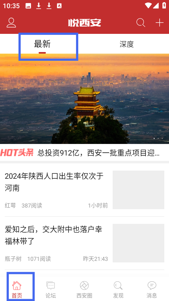 1、首頁的最新頁背景為西安城市風景圖,展示西安重點項目投資等熱點頭條,及人口、教育相關資訊信息豐富。