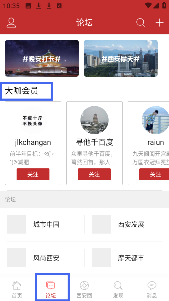 2、論壇界面有晚安打卡等話題大咖會員區可關注達人,下方分城市中國、西安發展等板塊方便交流城市話題。