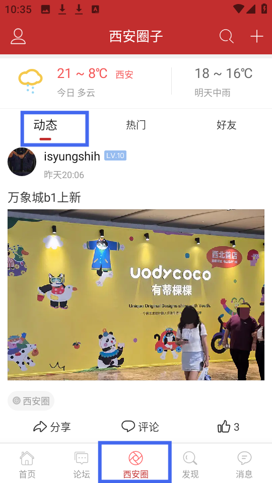 3、西安圈子的動態頁面,顯示當地天氣,呈現萬象城品牌上新等用戶分享,提供互動功能,便于了解城市生活新鮮事。