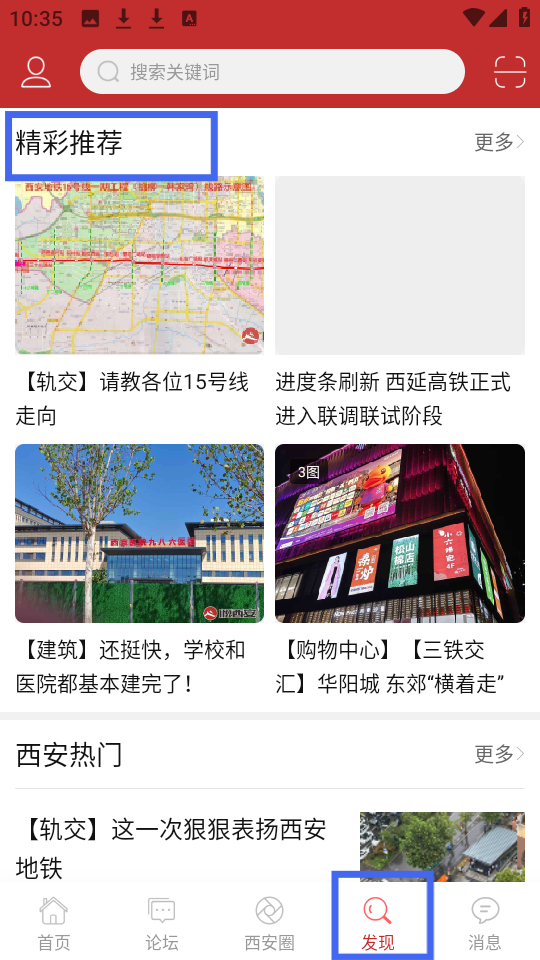 4、發現頁面的精彩推薦,含西安地鐵等內容,涉及軌交進度、建筑成果、購物中心動態,還有西安熱門討論專區。