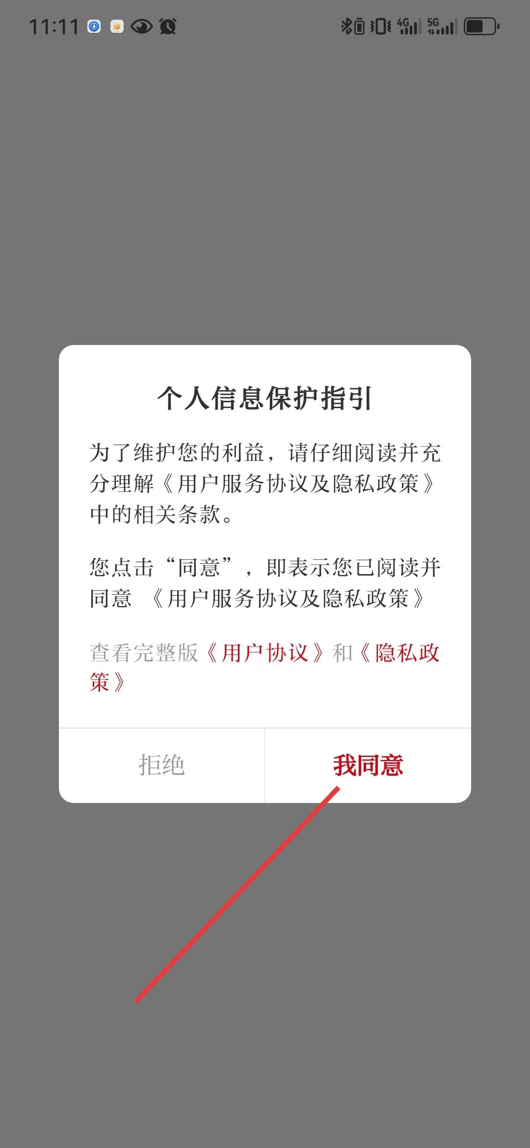 1、首次打開APP會彈出用戶協議及隱私政策界面,需仔細閱讀后點擊同意才能繼續使用APP,這一步是為了確保用戶了解并同意平臺使用個人信息的規則。