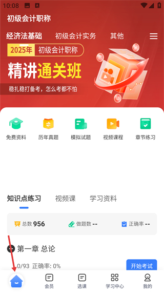 2、登錄后進入首頁,可見初級會計職稱精講通關班,還有免費資料歷年真題等功能,點擊開始考試可進行知識點練習。