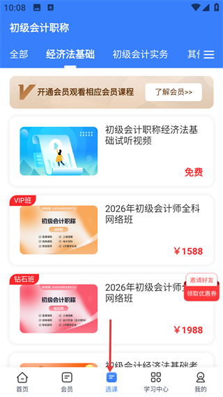 3、切換到選課界面,能看到經濟法基礎分類下的課程,有免費試聽視頻,還有VIP班鉆石班等付費課程可供選擇。