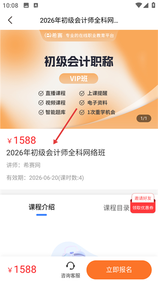4、點擊課程進入詳情頁,可查看VIP班包含的直播課程等服務,顯示課程價格及有效期,可咨詢客服或點擊立即報名。