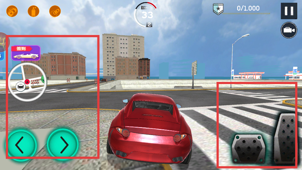 4、駕駛時左側有方向控制按鈕和小地圖,右側是剎車與油門踏板,要靈活操作方向和踏板,在城市道路中平穩駕駛完成行駛任務。
