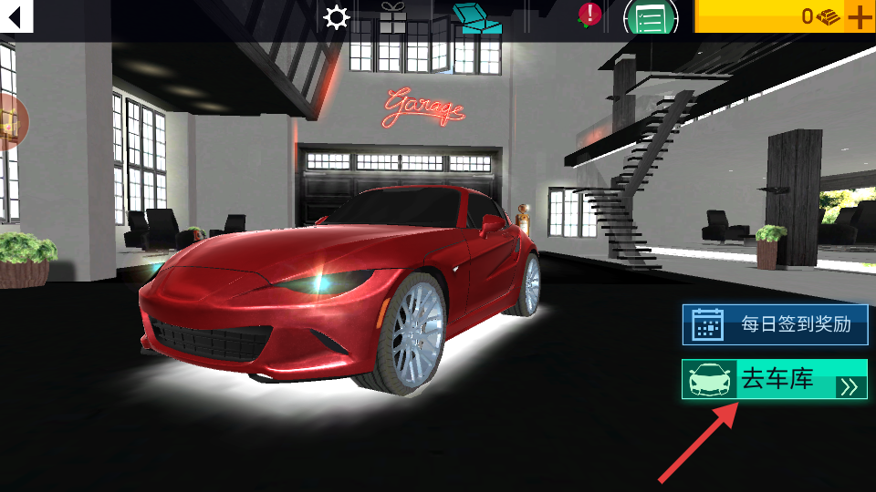1、玩家進入游戲后,可以看見界面有每日簽到獎勵和去車庫按鈕,點擊去車庫可進入車庫選擇車輛,開啟駕駛準備流程。