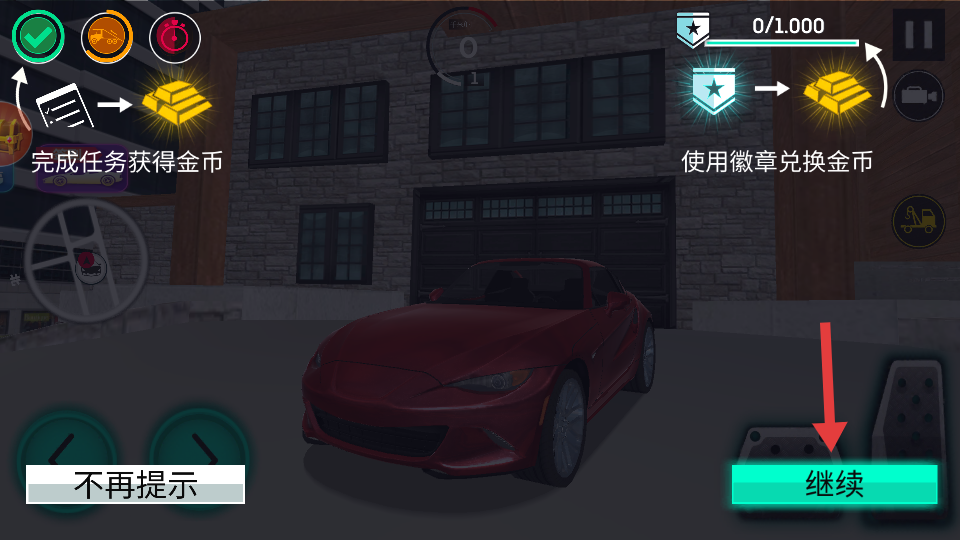 3、駕駛前會有提示,可通過完成任務或用徽章兌換金幣,了解后點擊繼續,正式進入駕駛環節,開始在城市道路行駛。
