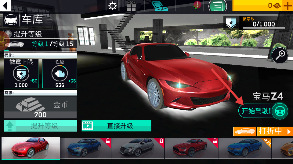 2、車庫中能看到寶馬Z4等車輛,點擊開始駕駛按鈕,即可駕駛選中車輛,同時也可通過提升等級或直接升級來強化車輛性能。