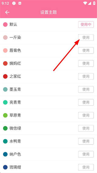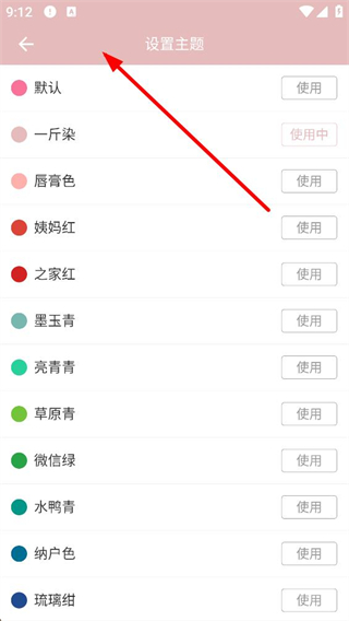 4、點擊一斤染對應的使用按鈕后,該主題切換為使用中,默認主題的使用中標識消失,可點擊左上角返回鍵回到上一界面。