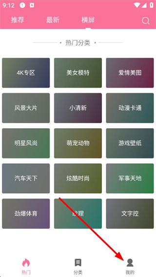 1、進入應用后看到推薦最新橫屏選項,下方熱門分類包含4K專區美女模特等類別,底部有熱門分類我的入口,點擊我的可進入個人界面。