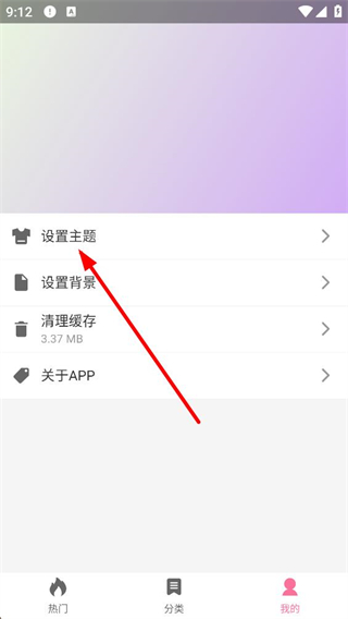 2、進入我的界面后能看到設置主題設置背景等選項,還有清理緩存功能,點擊設置主題選項可進入主題選擇頁面。