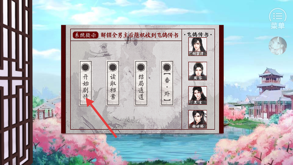 2、進入后界面有開始劇情、讀取檔案等選項,點擊開始劇情能從零開始體驗游戲劇情,還可解鎖男主后收飛鴿傳書。