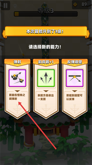 2、冒險升級后可選擇新能力,如彈射,獲得在怪物之間彈射的攻擊方式,增強戰斗能力。