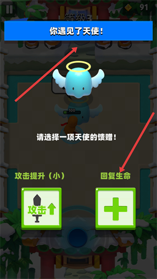 3、遇見天使可選擇饋贈,如攻擊提升或回復生命,獲得增益效果,助力后續冒險。