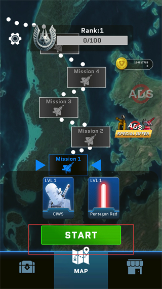 1、在游戲地圖界面,可看到不同的任務點擊START按鈕選擇相應任務,利用無限金幣的優勢,可提前為防空炮等裝備進行升級。