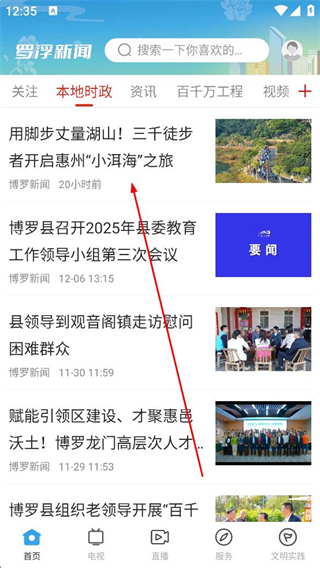 2、登錄成功后進入本地時政板塊,瀏覽資訊列表選擇用腳步丈量湖山相關條目,點擊進入該資訊的詳情頁面。