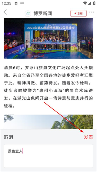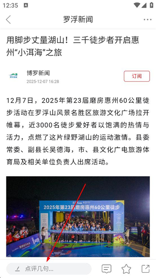 3、在資訊詳情頁閱讀關于惠州徒步活動的內容,找到點評幾句輸入框,點擊激活后輸入想要發布的評論內容。