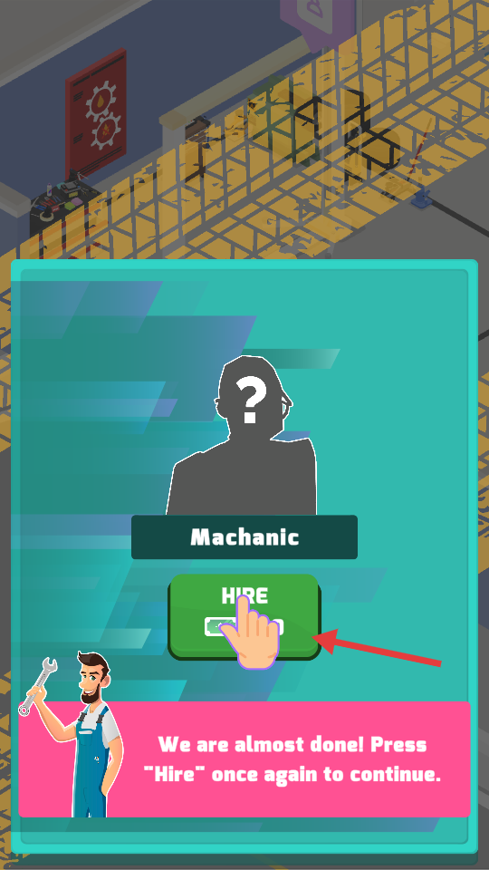 2、接著界面顯示機械師剪影,再次點擊綠色HIRE按鈕,完成機械師雇傭,這樣就能擁有第一位員工,助力車庫工作開展。