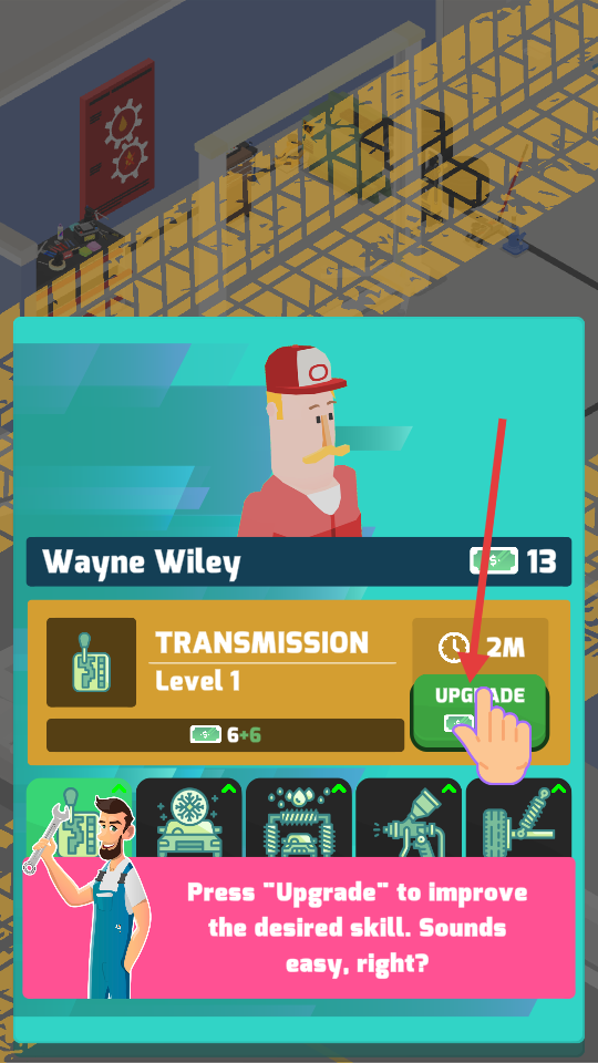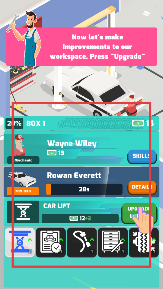 4、之后要對工作區進行改進,點擊CAR LIFT等設施旁的UPGRADE按鈕,消耗資金升級設備,優化車庫工作環境提升運營效率。
