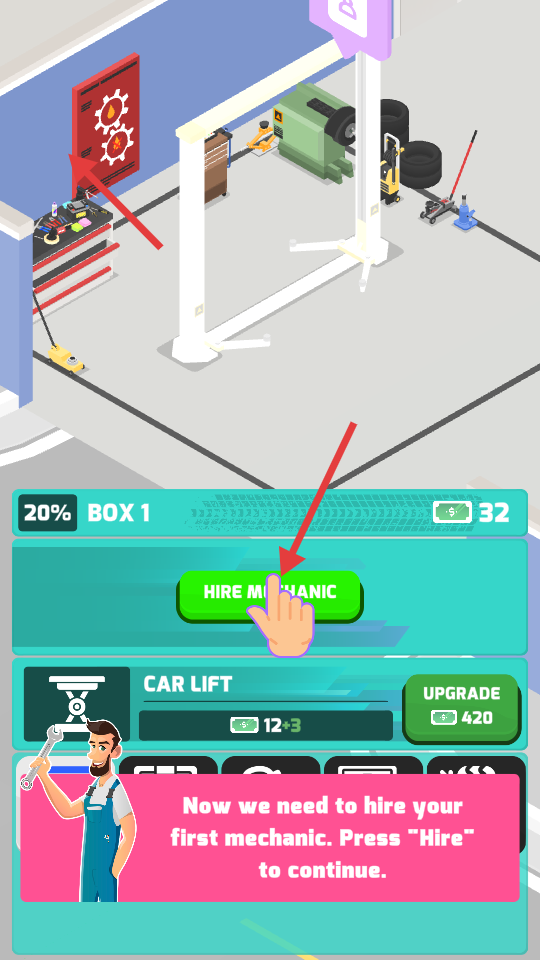 1、游戲開始界面提示需要雇傭第一個機械師,點擊綠色的HIRE MECHANIC按鈕,即可啟動雇傭流程,為車庫運營增添人力。
