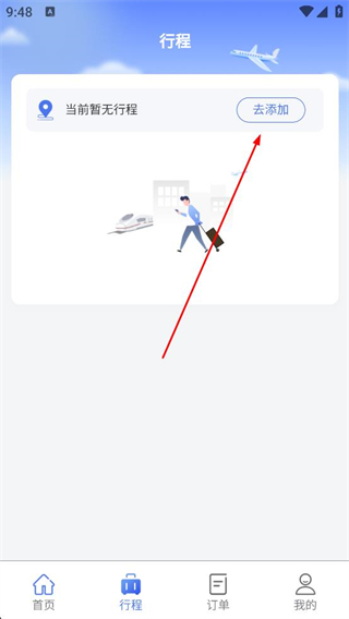 3、登錄后進入行程頁面看到當前暫無行程提示,點擊去添加按鈕,進入行程添加相關頁面。