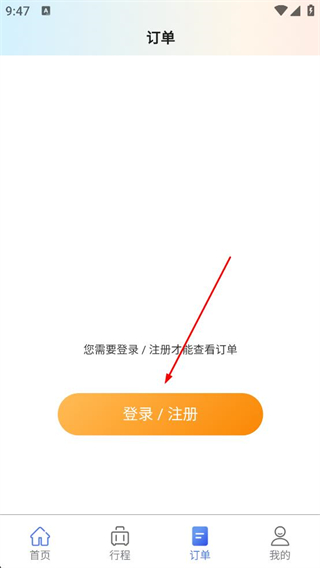 1、進入同程商旅APP訂單頁面,看到需登錄注冊才能查看訂單提示,點擊登錄注冊按鈕,進入登錄頁面準備登錄賬號。
