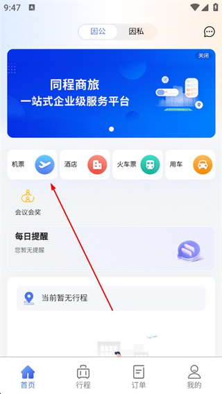 3、同程商旅首頁分因公、因私模式,一站式企業級服務平臺,機票酒、酒店等快捷入口,搭配會議會獎、每日提醒板塊,布局清晰,助力用戶高效規劃商旅出行。