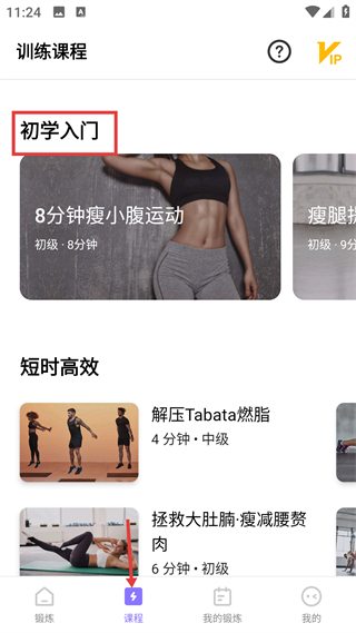 1、課程頁分初學入門短時高效等分類,提供不同部位時長的初級課程,如8分鐘瘦小腹運動,滿足新手基礎健身需求。