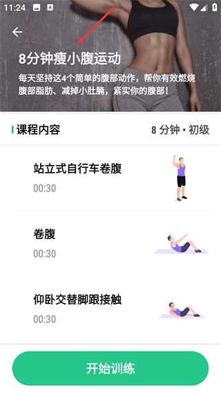 2、瘦小腹課程是8分鐘初級訓練,含站立式自行車卷腹等動作,每個動作30秒,可燃燒腹部脂肪,點擊開始訓練即可啟動。