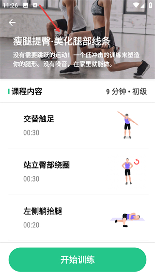 3、瘦腿提臀課程為9分鐘初級低沖擊訓練,無跳躍動作,含交替觸足等動作,適合居家練習,能美化腿部線條。