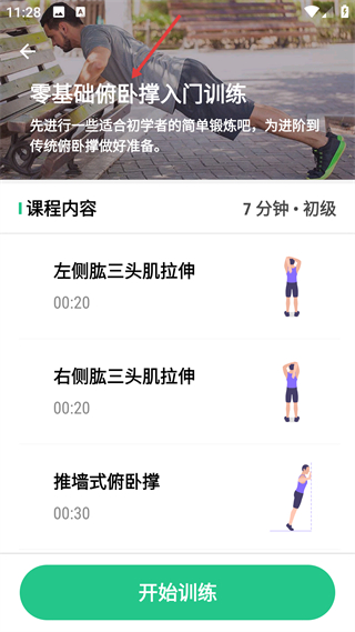 4、俯臥撐入門課程是7分鐘初級訓練,含肱三頭肌拉伸等動作,幫助初學者準備進階傳統俯臥撐,降低入門難度。
