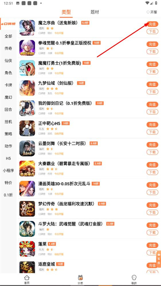 4、分類頁面,可瀏覽傳奇、仙俠等多種類型游戲,選擇魔之序曲等游戲,點擊充值或下載,進行游戲相關操作。