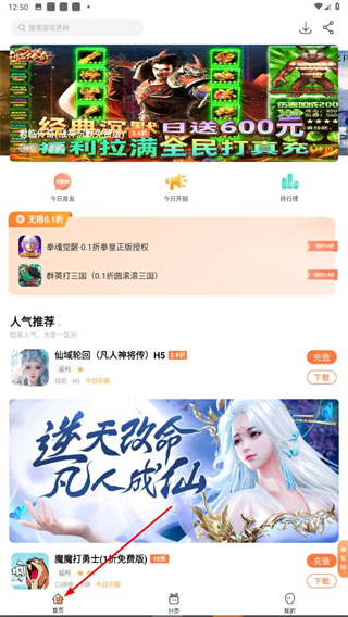 1、進入平臺首頁,可瀏覽今日首發、今日開服等板塊,查看人氣推薦等游戲,獲取游戲推薦。