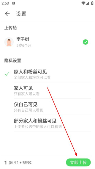 4、在設置頁面可選擇上傳給的對象和隱私設置,如家人和粉絲可見等,確認設置后點擊立即上傳,可將寶寶的成長照片上傳至APP,永久保存成長足跡。