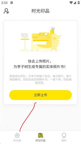 2、在時光印品頁面可查看生成實體照片書的提示,點擊立即上傳可進入照片編輯頁面,開始為寶寶生成專屬照片書。