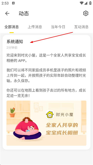 1、進入時光小屋APP動態頁面,可查看系統通知和各類消息,了解APP的功能介紹,以便熟悉如何使用該APP記錄寶寶成長。