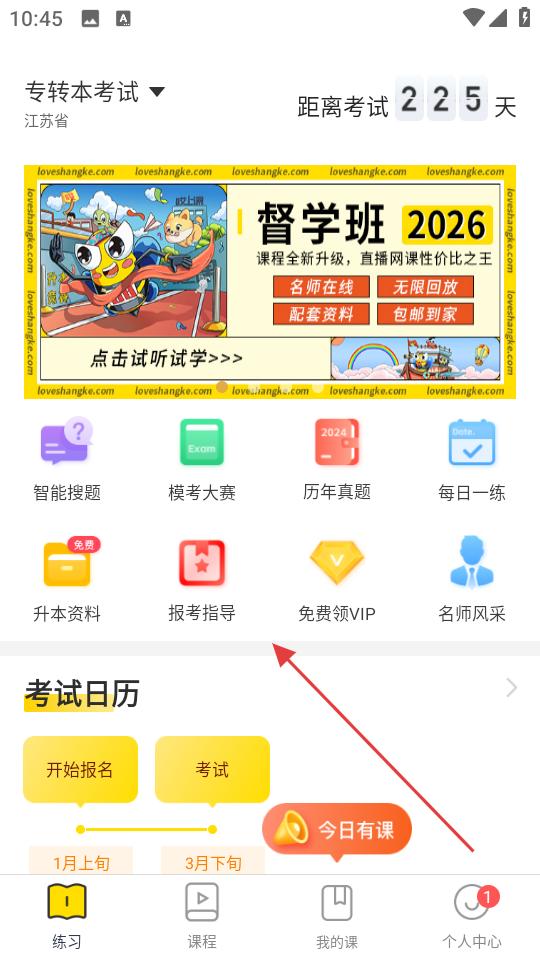 1、在練習頁面,可使用智能搜題??即筚惖裙δ?,點擊報考指導,了解專升本報考流程與注意事項,還能參與免費領VIP活動獲取更多權益。