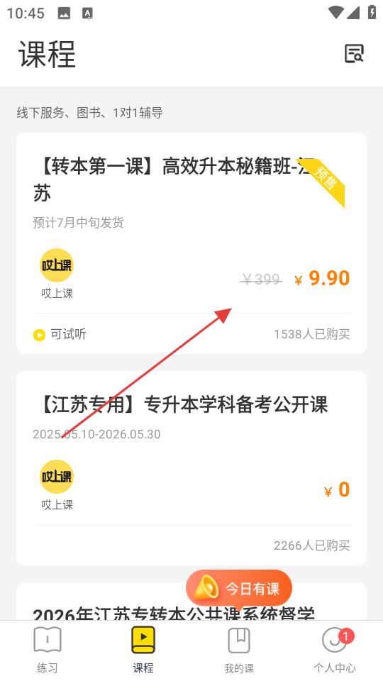 2、切換至課程頁面,瀏覽轉本第一課高效升本秘籍班等課程,查看課程價格、試聽權限及購買人數,選擇適合的專升本備考課程。