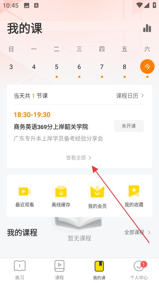 3、進入我的課頁面,查看當天課程安排,如商務英語分享會等,點擊查看全部了解更多課程詳情,使用最近觀看離線緩存等功能輔助學習。